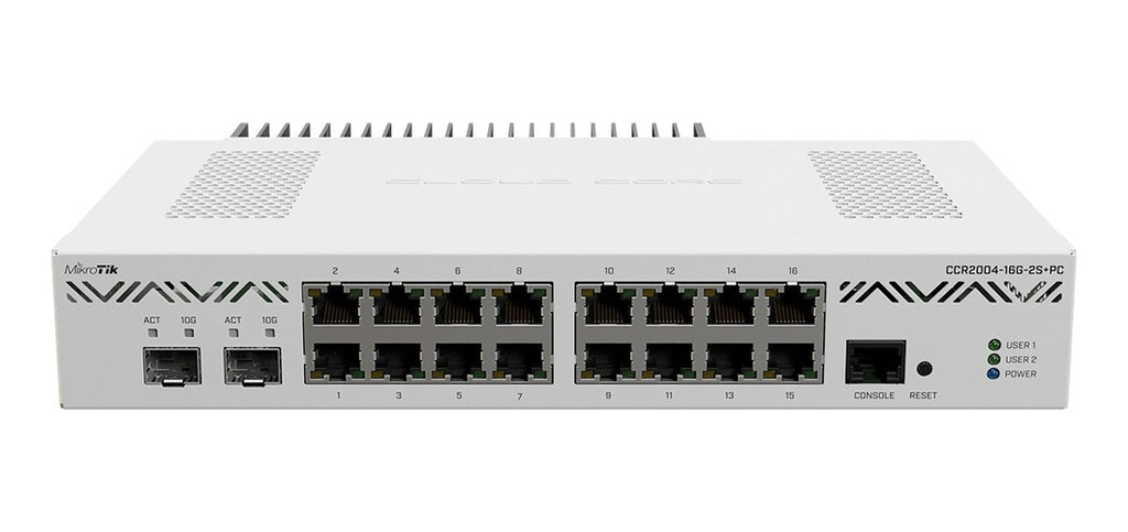 Hasta un 300 % más rápido que los enrutadores CCR1009 anteriores, ¡en un maravilloso silencio! El lujo que te mereces por el precio que puedes pagar. 16 puertos Gigabit Ethernet, 2 jaulas SFP+ de 10 G.