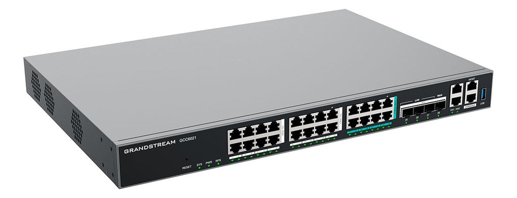 Grandstream GCC6021, Dispositivo 4 en 1, Conmutador IP, Firewall, Ruteador VPN y Switch, 16 puertos GEth, 8 puertos 2.5GEth, 8 PoE/bt, 16 PoE/at, 4 SFP+, 1 USB, 1 Consola, 2 HA, 1 MGMT, Muti-WAN, gestión local oa través de GDMS, kit para rack