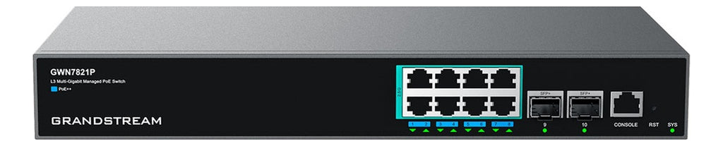 GRANDSTREAM GWN7821P, Switch de agregación PoE++ Administrable capa 3, 8 puertos Eth de 2.5G con PoE 802.3af/at/bt de hasta 60w, 2 slots SFP+ de 10Giga, fuente de 280w, soporta stacking