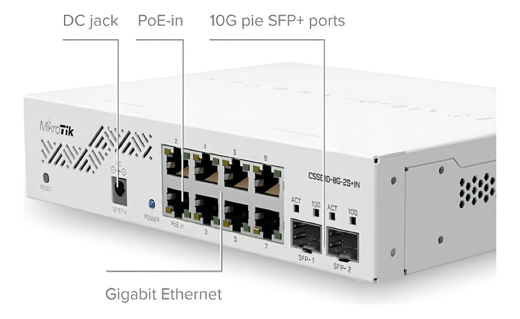 Switch de 8 puertos Giga Ethernet PoE 802.3af/at, 2 puertos SFP+ de 10Gb, p/rack, SwitchOS Lite